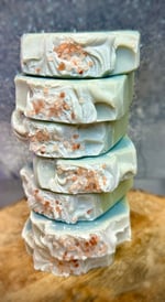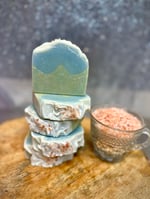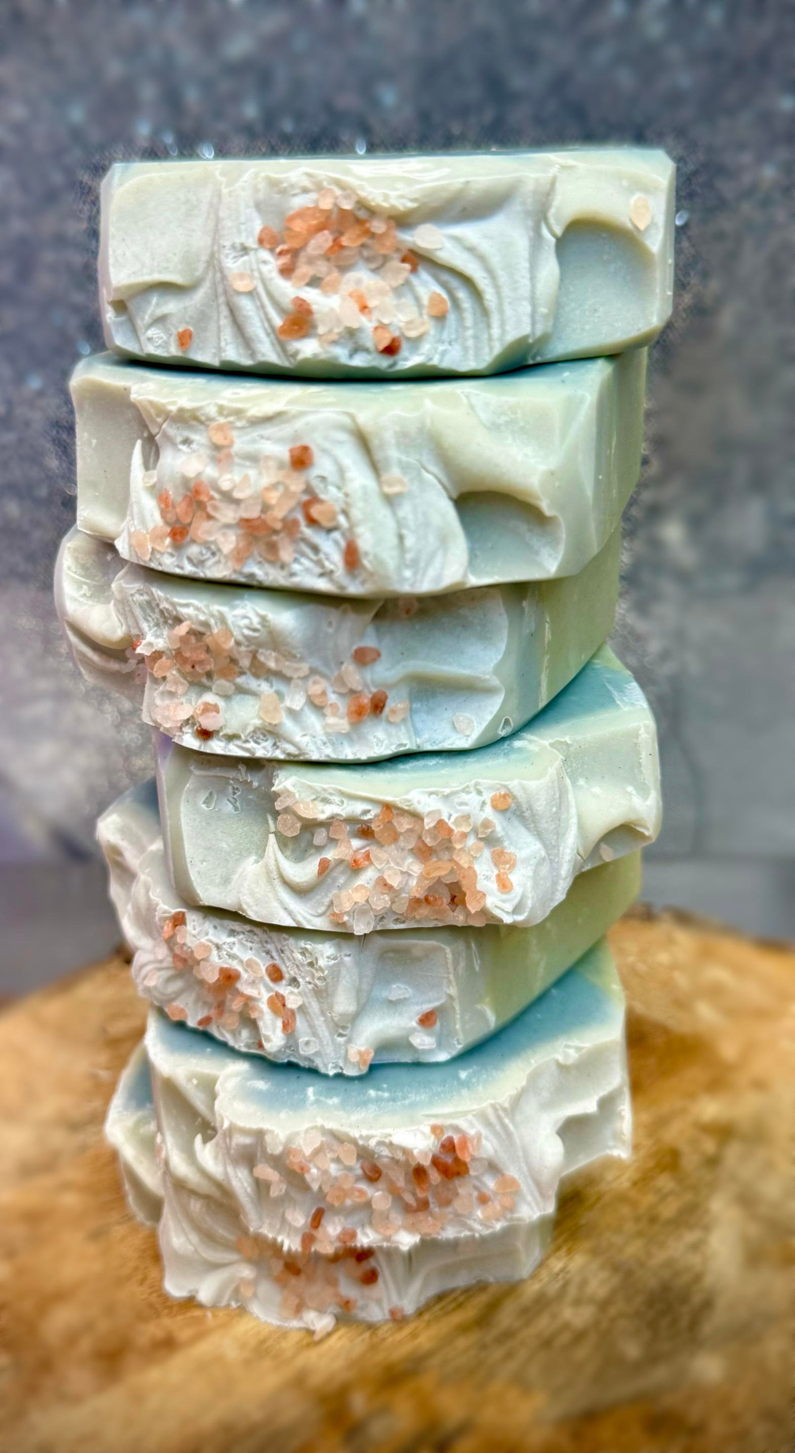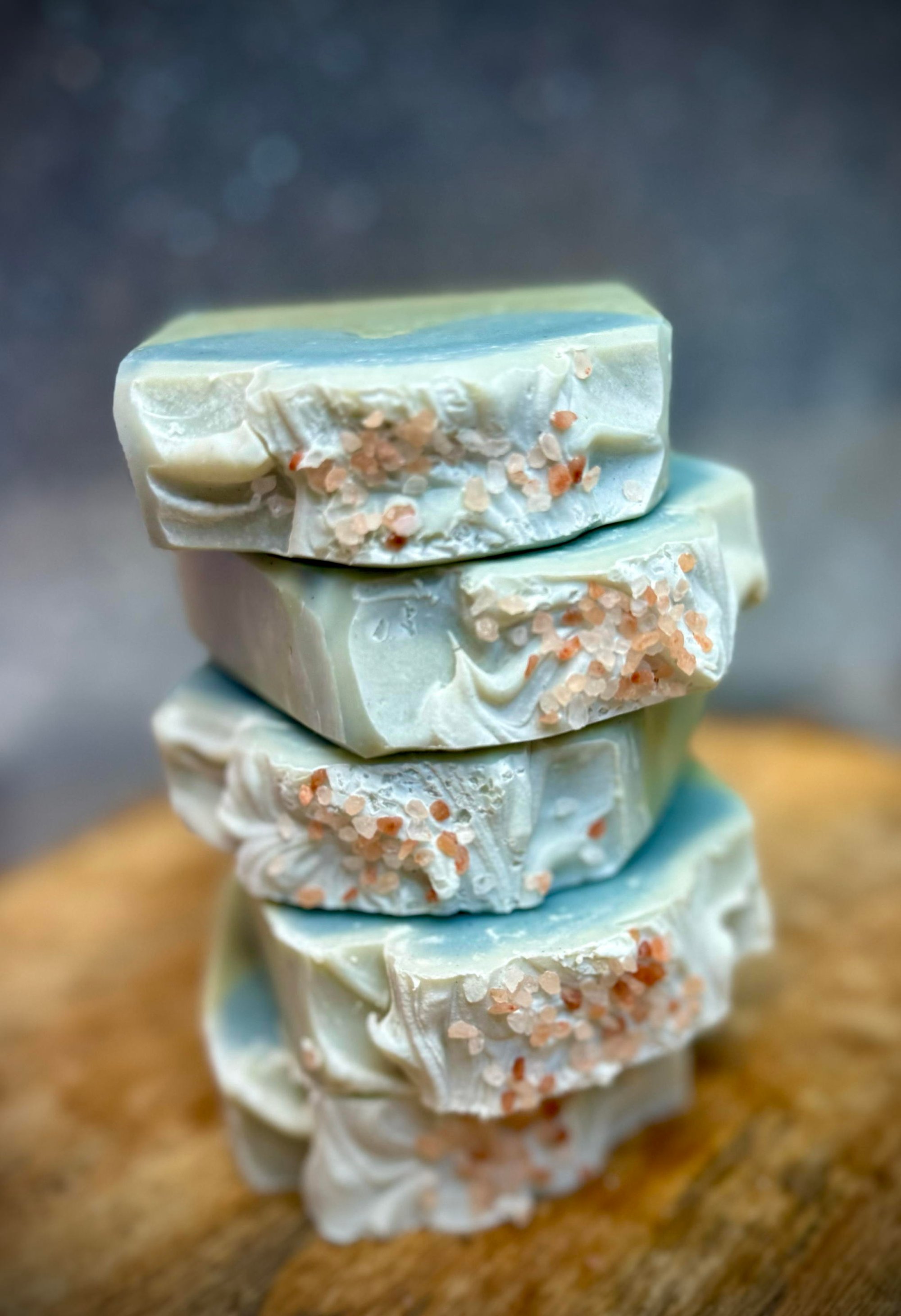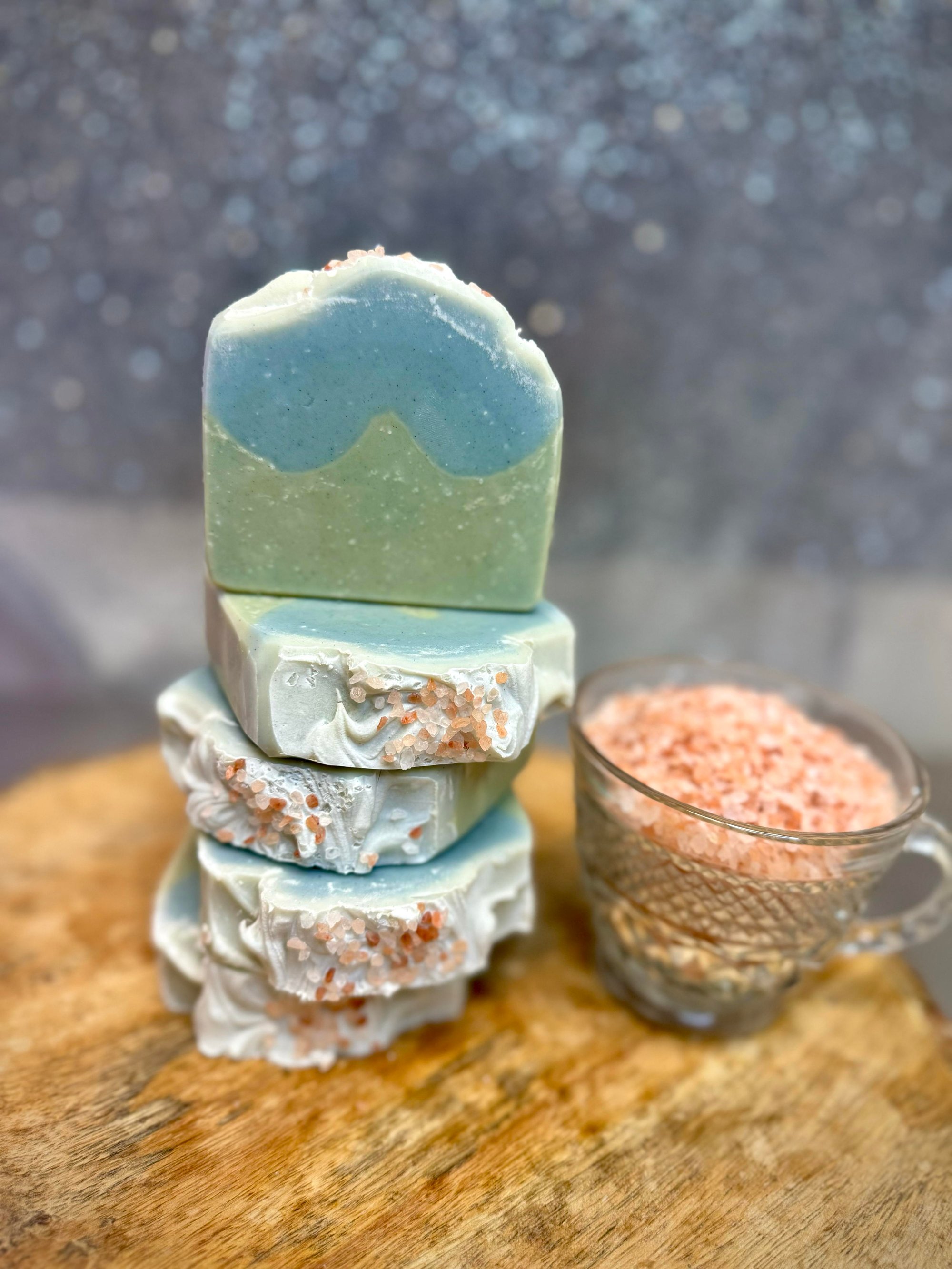 100% Natural Ingredients: Saponified organic coconut oil, olive oil, raw shea butter, sweet almond oil, avocado oil, castor oil, fine grain Celtic Sea Salt, Pink Himalayan salt, French green clay, indigo, kelp powder, and a blend of lavender & peppermint essential oils.