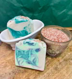 Ingredients: Saponified organic coconut oil, olive oil, argan oil, shea butter, aloe vera juice, Pink Himalayan Salt, Celtic Sea Salt, sea clay, skin-safe pigments, and clean white lily fragrance.