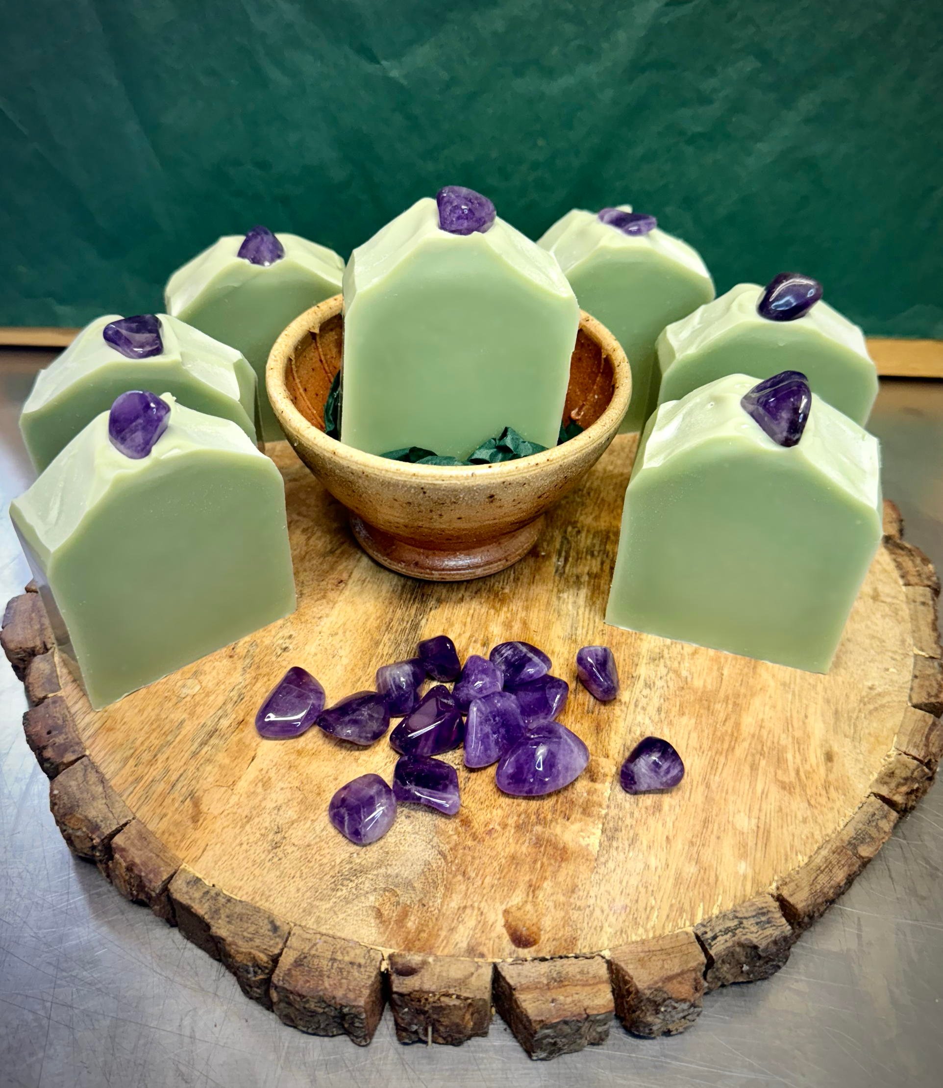 This soap is also special because I added genuine polished amethyst gemstones to the top! Purple and green are my favorite color combinations -- the amethyst adds a gorgeous natural purple to the green of the soap, and you can keep the gemstone forever. Metaphysical folks think amethyst has spiritual properties and increase feelings of tranquility and relaxation.